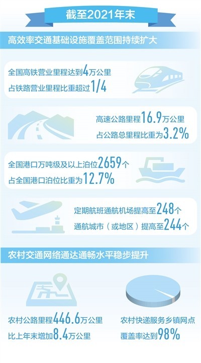 高效率交通基礎設施覆蓋范圍持續擴大。截至2021年末,全國高鐵營業里程達到4萬公里,占鐵路營業里程比重超過1/4。高速公路里程16.9萬公里,比上年末增加8090公里,占公路總里程比重為3.2%,呈現穩步提高態勢。全國港口萬噸級及以上泊位2659個、增加67個,占全國港口泊位比重為12.7%、提高1個百分點。定期航班通航機場、通航城市(或地區)分別提高至248個和244個。