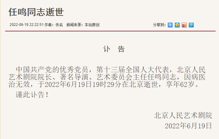 中國共產黨的優秀黨員,第十三屆全國人大代表,北京人民藝術劇院院長、著名導演、藝術委員會主任任鳴同志,因病醫治無效,于2022年6月19日19時29分在北京逝世,享年62歲。