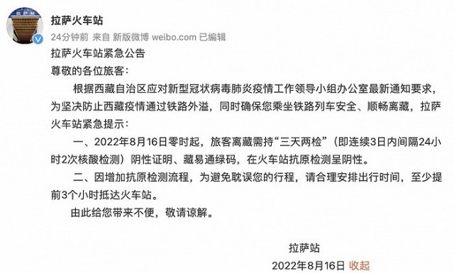 央視網(wǎng)消息:據(jù)@拉薩火車站 微博消息,根據(jù)西藏自治區(qū)應對新型冠狀病毒肺炎疫情工作領導小組辦公室最新通知要求,為堅決防止西藏疫情通過鐵路外溢,同時確保您乘坐鐵路列車安全、順暢離藏,拉薩火車站緊急提示:8月16日零時起,旅客離藏需持“三天兩檢”(即連續(xù)3日內(nèi)間隔24小時2次核酸檢測)陰性證明、藏易通綠碼,在火車站抗原檢測呈陰性。因增加抗原檢測流程,請至少提前3個小時抵達火車站。