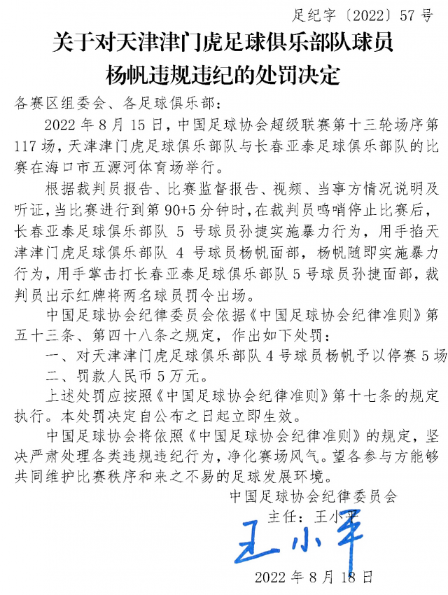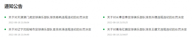18日晚,中國足協網站發布4則球員、俱樂部官員違規違紀的處罰決定,中超天津津門虎球員楊帆、中超長春亞泰球員孫捷及中乙青島紅獅球員王建文均停賽5場,中甲遼寧沈陽城市足球俱樂部官員林濤6場比賽禁止進入體育場。處罰決定全文如下:
