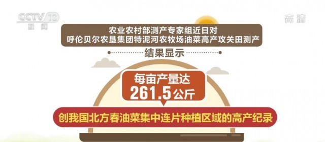 央視網消息:記者從內蒙古自治區農牧廳獲悉,農業農村部測產專家組近日對呼倫貝爾農墾集團特泥河農牧場油菜高產攻關田測產的結果顯示,每畝產量達261.5公斤,創我國北方春油菜集中連片種植區域的高產紀錄。