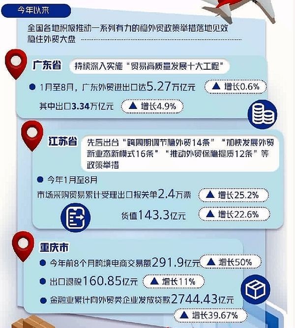 跨境電商等新業(yè)態(tài)也成為穩(wěn)外貿(mào)的重要力量。今年,重慶成功舉辦了跨境電商交易會(huì),積極推動(dòng)跨境電商“保稅進(jìn)口+零售分裝”業(yè)務(wù)試點(diǎn),推廣“跨境電商+產(chǎn)業(yè)帶”模式,為外貿(mào)企業(yè)穩(wěn)訂單、拓市場提供了新的解決方案。今年前8個(gè)月,重慶跨境電商交易額達(dá)291.9億元,增長50%。