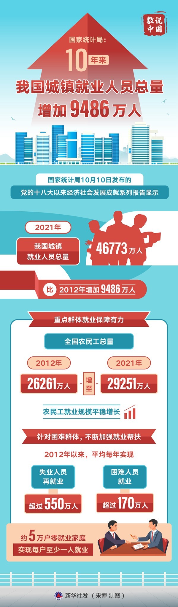 新華社北京10月10日電(記者魏玉坤)國家統計局10日發布的黨的十八大以來經濟社會發展成就系列報告顯示,2021年,我國城鎮就業人員總量達到46773萬人,比2012年增加9486萬人。