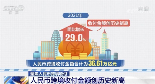 央視網(wǎng)消息:經(jīng)過(guò)十余年的發(fā)展,人民幣國(guó)際化正煥發(fā)出旺盛的生命力。數(shù)據(jù)顯示,2021年,人民幣跨境收付金額創(chuàng)歷史新高。在我國(guó)金融機(jī)構(gòu)、企業(yè)和個(gè)人開(kāi)展的跨境交易總額中,有近一半已經(jīng)使用人民幣進(jìn)行結(jié)算。