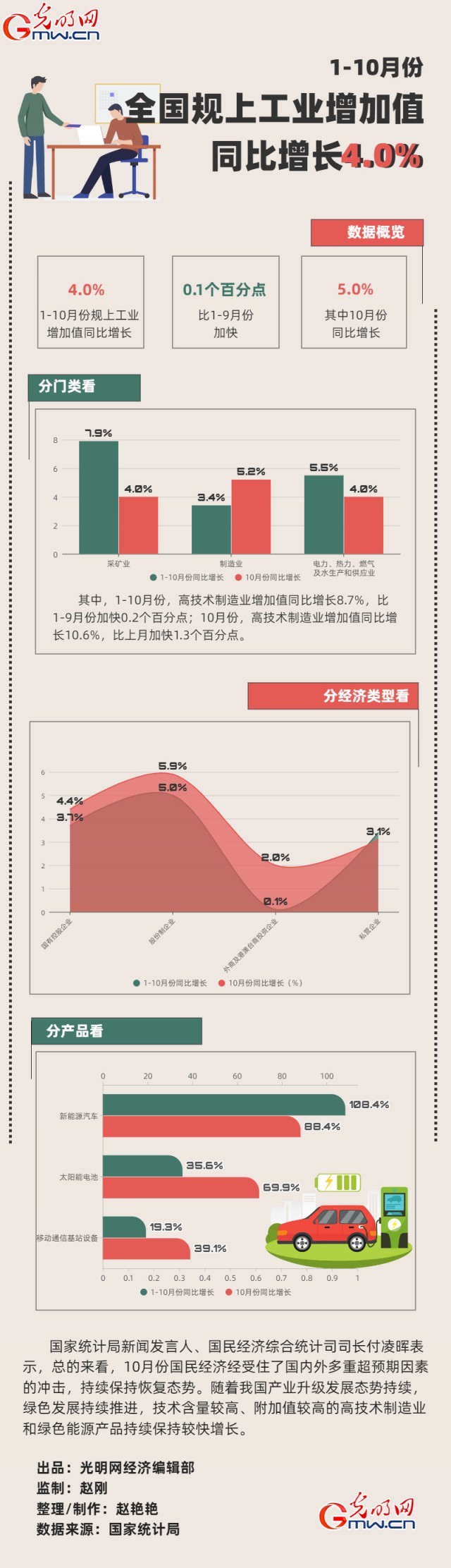 數據顯示,1-10月份,全國規模以上工業增加值同比增長4.0%,比1-9月份加快0.1個百分點。分三大門類看,采礦業增加值同比增長7.9%,制造業增長3.4%,電力、熱力、燃氣及水生產和供應業增長5.5%。高技術制造業增加值同比增長8.7%,比1-9月份加快0.2個百分點。分經濟類型看,國有控股企業增加值同比增長3.7%;股份制企業增長5.0%,外商及港澳臺商投資企業增長0.1%;私營企業增長3.4%。分產品看,新能源汽車、太陽能電池、移動通信基站設備等綠色智能產品產量同比分別增長108.4%、35.6%、19.3%。