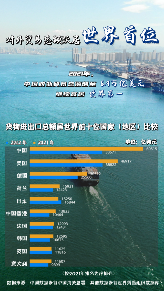 2020年中國對外貿易總額由2012年的4.4萬億美元升至5.3萬億美元,首超美國成為全球第一大貿易國。2021年,中國對外貿易總額加快上升增至6.9萬億美元,繼續高居世界第一。在經濟全球化頻遭單邊主義、保護主義等“逆流”襲擾的歷史當口,中國從融入和適應全球化走向推動和引領全球化,積極倡導建設開放型世界經濟,推動經濟全球化朝著更加開放、包容、普惠、平衡、共贏方向發展。目前,中國已成為140多個國家和地區的主要貿易伙伴,形成更大范圍、更寬領域、更深層次對外開放格局。