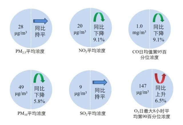 1—11月,全國(guó)339個(gè)地級(jí)及以上城市平均空氣質(zhì)量?jī)?yōu)良天數(shù)比例為86.8%,同比下降0.8個(gè)百分點(diǎn);PM2.5平均濃度為28微克/立方米,同比持平;PM10平均濃度為49微克/立方米,同比下降5.8%;O3平均濃度為147微克/立方米,同比上升6.5%;SO2平均濃度為9微克/立方米,同比持平;NO2平均濃度為20微克/立方米,同比下降9.1%;CO平均濃度為1.0毫克/立方米,同比下降9.1%。