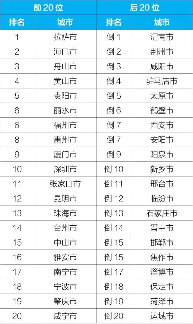1—11月,168個(gè)重點(diǎn)城市中,拉薩、海口和舟山市等城市空氣質(zhì)量相對(duì)較好(從第1名至第20名);渭南、荊州和咸陽(yáng)市等城市空氣質(zhì)量相對(duì)較差(從倒數(shù)第1名至倒數(shù)第20名),見(jiàn)附表2。