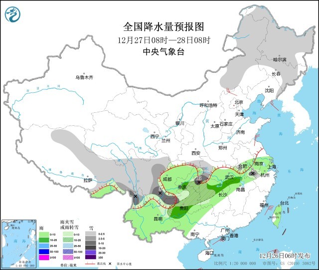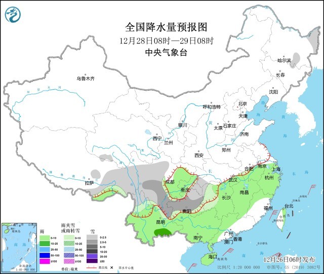 預計今天夜間至29日,南方地區將出現一次雨雪天氣過程,西藏東部、云南北部、川西高原、重慶東南部、貴州、湖南西部、湖北西部、安徽南部、浙江西北部等地將有小到中雪或雨夾雪,貴州中部和東部、湖南西部局地大到暴雪,貴州西部局地有凍雨;四川盆地、云南中南部、湖南南部、江西大部、浙江大部、福建北部以及廣西、廣東北部等地有小雨,局地中雨;主要降水時段為27日至28日。