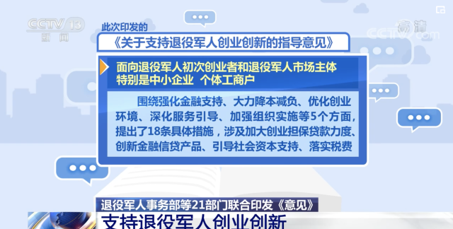 此次印發的《關于支持退役軍人創業創新的指導意見》,面向退役軍人初次創業者和退役軍人市場主體,特別是中小企業、個體工商戶。圍繞強化金融支持、大力降本減負、優化創業環境、深化服務引導、加強組織實施等5個方面,提出了18條具體措施,涉及加大創業擔保貸款力度、創新金融信貸產品、引導社會資本支持、落實稅費減免、緩解租金壓力、優化供地保障、落實補貼優惠、完善公共服務、開展創業培訓、加強個體工商戶引導扶持等,進一步提升退役軍人創業創新能力,培育壯大退役軍人市場主體,帶動更多退役軍人就業。