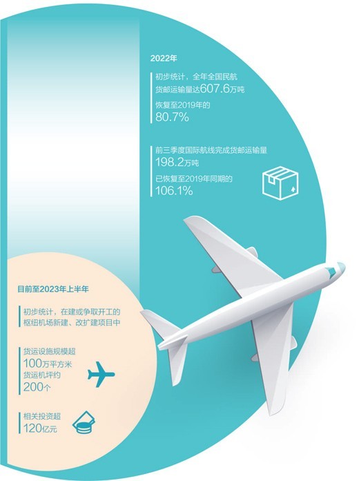 民航局有關負責人介紹,過去5年,航空貨運基礎設施建設取得積極進展,新增航空貨運能力600萬噸以上。下一步,將加強航空貨運設施規劃建設指導,初步統計,目前至2023年上半年在建或爭取開工的樞紐機場新建、改擴建項目中,貨運設施規模已超過100萬平方米、貨運機坪約200個,相關投資超過120億元。