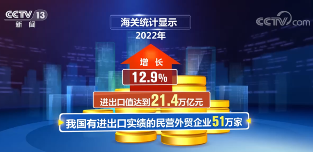 海關統(tǒng)計顯示,2022年,我國有進出口實績的民營外貿企業(yè)51萬家,進出口值達到21.4萬億元,增長12.9%。2022年,民營企業(yè)進出口規(guī)模所占比重達到了50.9%,較上年提高2.3個百分點,對我國外貿增長的貢獻率達80.8%。