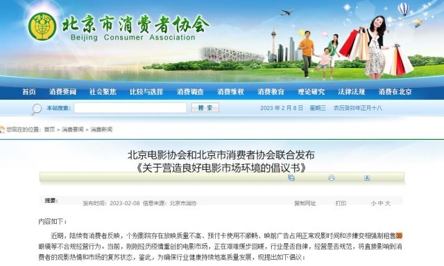 北京消費者協會倡議:維護電影市場秩序 加強對放映質量管理