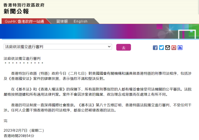 香港特區政府:堅決反對美國會有關機構及議員抹黑香港刑事司法程序