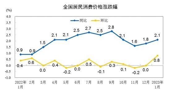 中新網2月10日電(中新財經記者 謝藝觀)10日,國家統計局公布2023年1月份全國居民消費價格(CPI)數據。受春節效應和疫情防控政策優化調整等因素影響,1月份CPI同比上漲2.1%,重回“2時代”。