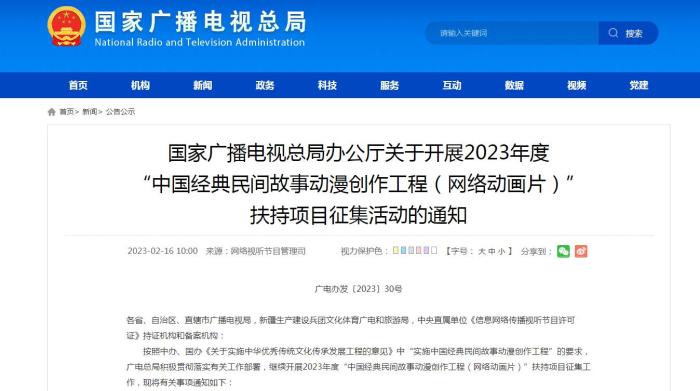 中新網2月16日電 16日,國家廣播電視總局辦公廳發布關于開展2023年度“中國經典民間故事動漫創作工程(網絡動畫片)”扶持項目征集活動的通知,旨在打造廣受觀眾認可、具有較大影響力的優秀作品。