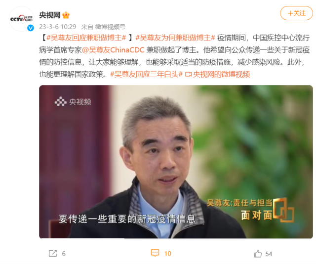 疫情期間,吳尊友兼職做起了博主。他希望向公眾傳遞一些關(guān)于新冠疫情的防控信息,讓大家能夠理解,也能夠采取適當(dāng)?shù)姆酪叽胧瑴p少感染風(fēng)險。此外,也能更理解國家政策。