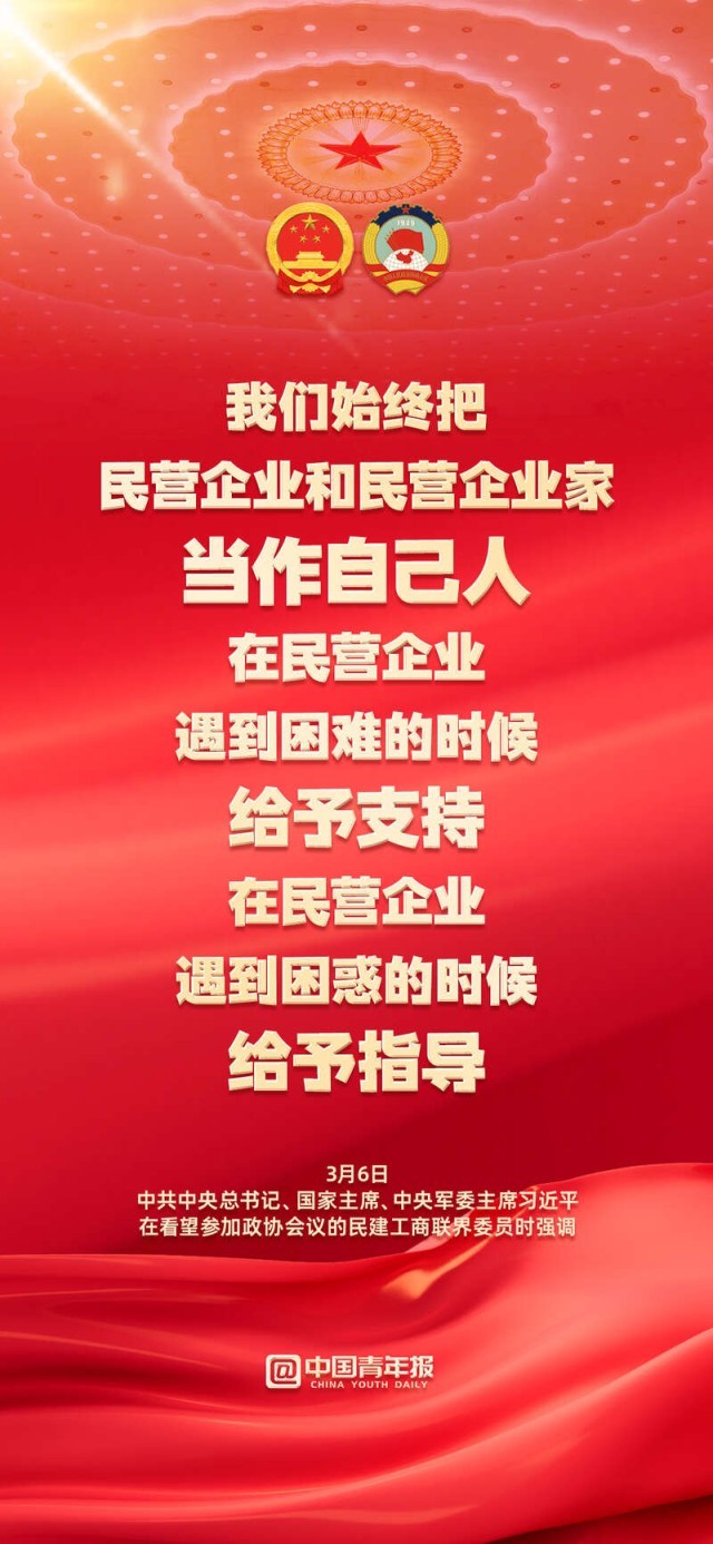 “始終把民營企業和民營企業家當作自己人”;“無論是國有企業還是民營企業,都是促進共同富裕的重要力量,都必須擔負促進共同富裕的社會責任。”3月6日下午,習近平總書記在看望參加政協會議的民建工商聯界委員時強調,要正確引導民營經濟健康發展高質量發展。關于民營企業和民營企業家,總書記作出哪些重要論述,轉存金句,共同學習