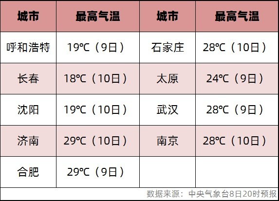 多地最高氣溫還將繼續(xù)突破紀(jì)錄。大城市中,呼和浩特、長春、沈陽、濟南、合肥氣溫都可能刷新當(dāng)?shù)?月上旬最高紀(jì)錄,石家莊、太原、武漢、南京等地也會經(jīng)歷同期少見的暖。