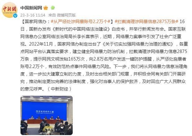 國家網信辦:攔截清理涉網絡暴力信息2875萬條,從嚴懲處涉網暴賬號2.2萬個