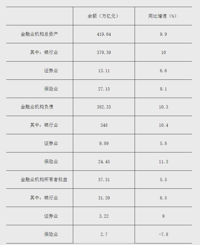金融業(yè)機構(gòu)負債為382.33萬億元,同比增長10.3%,其中,銀行業(yè)機構(gòu)負債為348萬億元,同比增長10.4%;證券業(yè)機構(gòu)負債為9.89萬億元,同比增長5.8%;保險業(yè)機構(gòu)負債為24.45萬億元,同比增長11.3%。