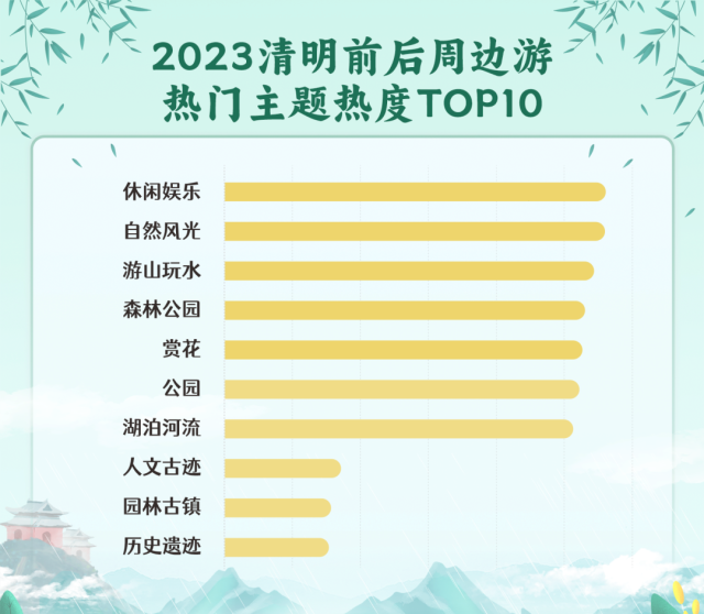 據某旅游票務平臺發布的《2023清明假期出游趨勢報告》,清明期間,本地及周邊短途出游是主流,出游主題上具有顯著的春游季特征?!秷蟾妗凤@示,清明假期(4月5日)前后周邊游的熱門主題按照熱度排序依次為休閑娛樂、自然風光、游山玩水、森林公園、賞花、公園等。前十個熱門主題中,具有賞花踏青屬性的主題占據了六席。