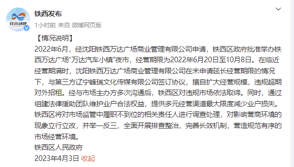 央視網消息:據@鐵西發布 微博4月3日消息,鐵西區人民政府發布情況說明。2022年6月,經沈陽鐵西萬達廣場商業管理有限公司申請,鐵西區政府批準舉辦鐵西萬達廣場“萬達汽車小鎮”夜市,經營期限為2022年6月20日至10月8日。在臨近經營期滿時,沈陽鐵西萬達廣場商業管理有限公司在未申請延長經營期限的情況下,與第三方遼寧峰瑞文化傳媒有限公司簽訂協議,擅自擴大經營規模,違規超期對外招租。經與市場主辦方多次溝通后,鐵西區對違規市場依法取締。同時,通過組建法律援助團隊維護業戶合法權益,提供多元經營渠道最大限度減少業戶損失。
