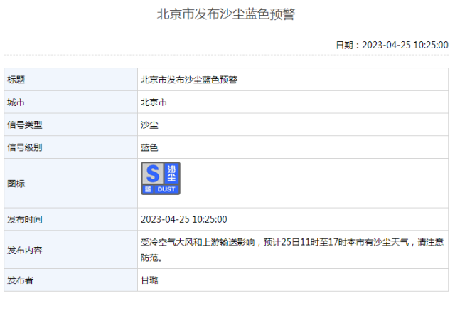 2023年04月25日10時25分,北京市氣象臺發布沙塵藍色預警。