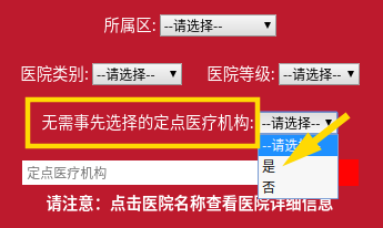 進入頁面后,點擊“無需事先選擇的定點醫療機構”選項,選擇“是”。