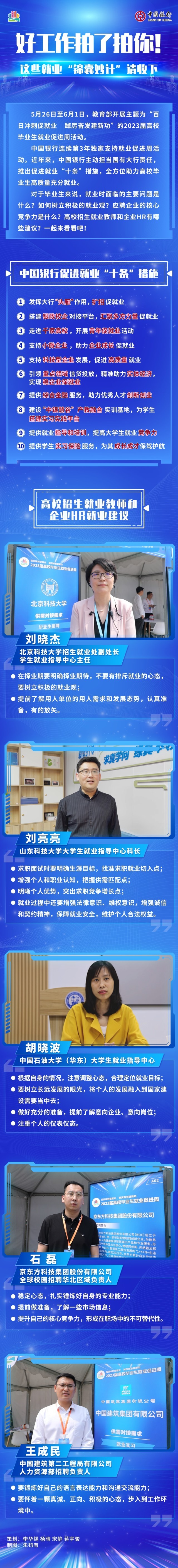 5月26日至6月1日,教育部開展主題為“百日沖刺促就業(yè)距厲奮發(fā)建新功”的2023屆高校畢業(yè)生就業(yè)促進周活動。中國銀行連續(xù)第3年獨家支持就業(yè)促進周活動。近年來,中國銀行主動擔當國有大行責任推出促進就業(yè)“十條”措施,全方位助力高校畢業(yè)生高質量充分就業(yè)。對于畢業(yè)生來說,就業(yè)時面臨的主要問題是什么? 如何樹立積極的就業(yè)觀? 應聘企業(yè)的核心競爭力是什么? 高校招生就業(yè)教師和企業(yè)HR有哪些建議? 一起來看看吧!(中國青年網(wǎng)記者 李華錫 楊晴 宋靜 蔣宇駿 朱鈞有)