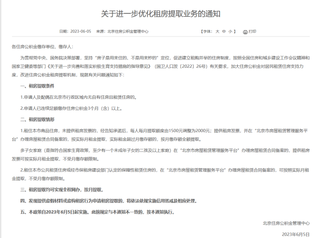 央視網消息:北京住房公積金管理中心發布《關于進一步優化租房提取業務的通知》,通知明確,提高無發票租房的提取額度,新申請無發票租房提取的提取額度從每月1500元提高至每月2000元;加大對多子女家庭租房的政策支持,多子女家庭可以按照實際月租金提取住房公積金;積極推動房屋租賃合同備案,申請提取前應辦理房屋租賃合同備案;提高租房提取的支付頻率,所有的租房提取的約定提取周期將統一成按月提取。