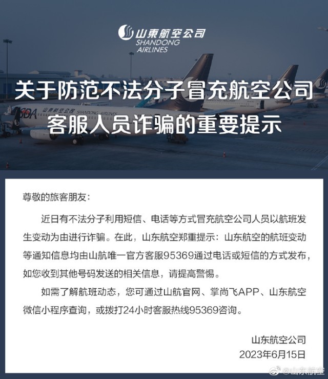 山東航空發布提示:近日有不法分子冒充航司人員以航班發生變動為由詐騙