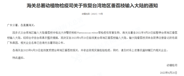 各海關(guān)自2023年6月20日起恢復(fù)受理臺灣地區(qū)番荔枝報關(guān),并依法依規(guī)實施檢驗檢疫。同時,請及時將上述情況通知轄區(qū)內(nèi)相關(guān)企業(yè)。