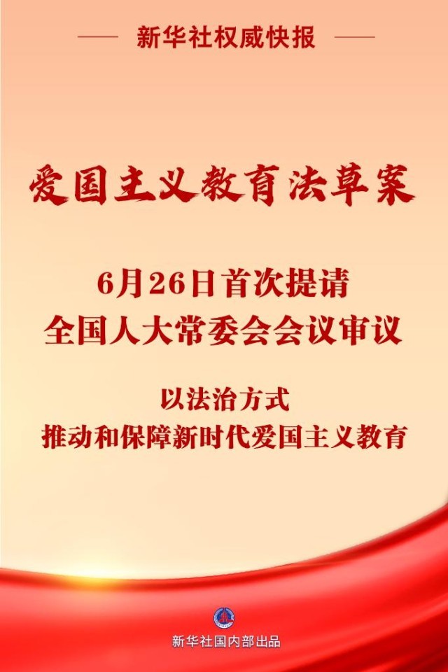 愛國主義教育法草案6月26日首次提請全國人大常委會會議審議。制定愛國主義教育法,以法治方式推動和保障新時代愛國主義教育,對于振奮民族精神、凝聚人民力量,推進強國建設(shè)、民族復(fù)興,具有十分重大而深遠(yuǎn)的意義。