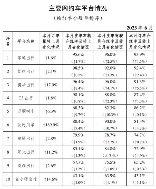 一、在訂單量前10名的網約車平臺中,訂單合規率最高的是享道出行,最低的是花小豬出行。在訂單量前10名的平臺中,按訂單合規率(指駕駛員和車輛均獲得許可的訂單量占比)從高到低的分別是享道出行、如祺出行、攜華出行、T3出行、萬順叫車、及時用車、曹操出行、陽光出行、滴滴出行、花小豬出行。本月訂單合規率增長前3名的依次是攜華出行、如祺出行、陽光出行;增長最后3名的依次是滴滴出行(-0.8%)、花小豬出行(-1.1%)、及時用車(-4.7%)。