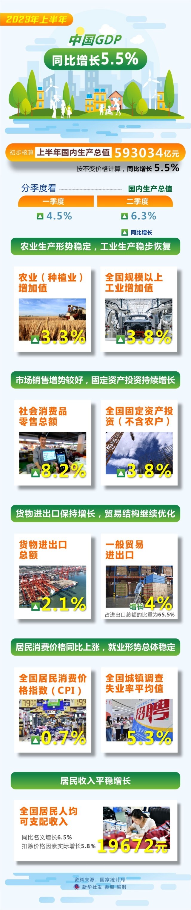 翻開半年報,國內生產總值比去年同期增長5.5%,社會消費品零售總額同比增長8.2%,第三產業增加值同比增長6.4%……多項指標顯示,我國經濟運行延續恢復向好態勢,同時物價、出口等部分指標增速放緩也引發關注。