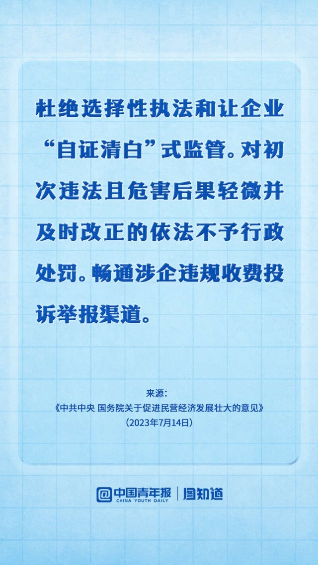 不得以備案、注冊等形式設定或變相設定準入障礙,未經(jīng)公平競爭不得授予經(jīng)營者特許經(jīng)營權,杜絕選擇性執(zhí)法和讓企業(yè)“自證清白”式監(jiān)管,依法嚴厲打擊以負面輿情為要挾進行勒索等行為......中共中央、國務院近日印發(fā)《關于促進民營經(jīng)濟發(fā)展壯大的意見》,其中提到多個“不得”,共同了解