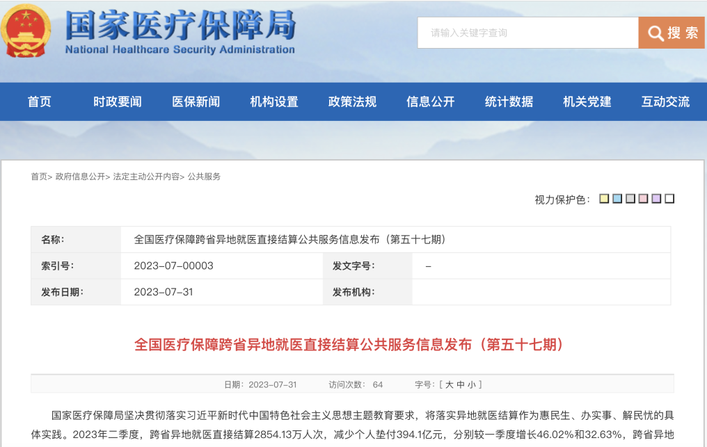 此外,住院費用跨省直接結算規(guī)模進一步增長。截至2023年二季度末,全國住院費用跨省聯(lián)網(wǎng)定點醫(yī)療機構達7.44萬家,較一季度末增長0.69萬家。2023年二季度,住院費用跨省直接結算282.57萬人次。