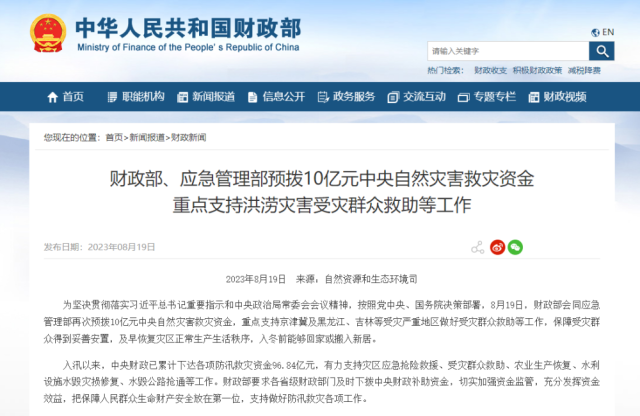 為堅決貫徹落實習近平總書記重要指示和中央政治局常委會會議精神,按照黨中央、國務院決策部署,8月19日,財政部會同應急管理部再次預撥10億元中央自然災害救災資金,重點支持京津冀及黑龍江、吉林等受災嚴重地區做好受災群眾救助等工作,保障受災群眾得到妥善安置,及早恢復災區正常生產生活秩序,入冬前能夠回家或搬入新居。