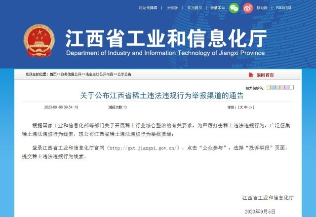 中新網(wǎng)9月6日電 據(jù)江西省工業(yè)和信息化廳官網(wǎng)6日消息,根據(jù)國家工業(yè)和信息化部等部門關(guān)于開展稀土行業(yè)綜合整治的有關(guān)要求,為嚴(yán)厲打擊稀土違法違規(guī)行為,廣泛征集稀土違法違規(guī)行為線索,現(xiàn)公布江西省稀土違法違規(guī)行為舉報(bào)渠道:登錄江西省工業(yè)和信息化廳官網(wǎng),點(diǎn)擊“公眾參與”,選擇“投訴舉報(bào)”頁面,提交稀土違法違規(guī)行為線索。