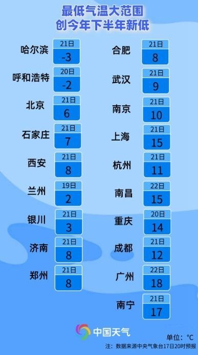 中東部地區最低氣溫的低點大多在20—21日,從黑龍江到廣東、廣西,大部地區最低氣溫都有可能創下今年立秋以來的新低,迎來最涼早晨。