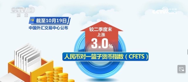 國家外匯管理局10月20日公布我國三季度外匯數據,截至10月19日,中國外匯交易中心公布的人民幣對一籃子貨幣指數(CFETS)較二季度末上漲3.0%。我國穩經濟政策持續發力并逐步顯效,人民幣對美元匯率略有貶值,對歐元、英鎊、日元等主要貨幣有所升值。人民幣匯率在全球貨幣中表現穩健。