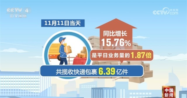 數(shù)據(jù)顯示,11月1日至11日,全國郵政快遞企業(yè)共攬收快遞包裹52.64億件,同比增長23.22%,日均業(yè)務量是平日業(yè)務量的1.4倍。其中11月11日當天,共攬收快遞包裹6.39億件,是平日業(yè)務量的1.87倍,同比增長15.76%。