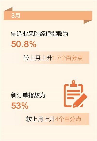 3月,隨著更好支持擴大內需,促進穩外貿穩外資等政策穩定發力,經濟內生動力不斷釋放,同時外部需求也有所改善,市場需求較好增長。新訂單指數為53%,較上月上升4個百分點,升幅較為明顯;新出口訂單指數為51.3%,較上月上升5個百分點,回到擴張區間。