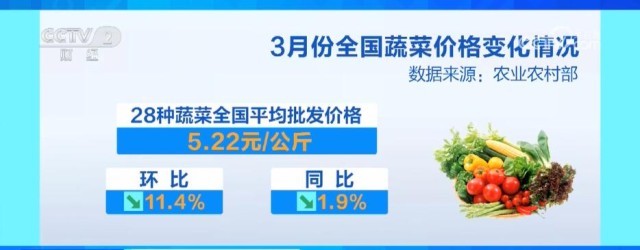 3月份,農業農村部監測的28種蔬菜全國平均批發價格為每公斤5.22元,環比下降11.4%,同比下降1.9%。分品種看,23種蔬菜價格環比下降,5種上漲,其中降幅較大的品種有菠菜、黃瓜、生菜和青椒。
