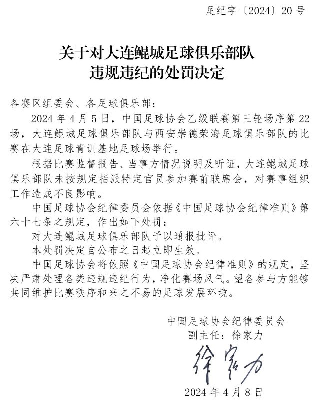 央視網消息:4月10日,中國足協網站發布《關于對上海嘉定匯龍足球俱樂部隊球員時間違規違紀的處罰決定》《關于對西安崇德榮海足球俱樂部隊違規違紀的處罰決定》《關于對大連鯤城足球俱樂部隊違規違紀的處罰決定》三份處罰決定。中甲聯賽上海嘉定匯龍9號球員因暴力行為被停賽罰款。中乙聯賽大連鯤城與西安崇德榮海兩家俱樂部因未按規定指派特定官員參加賽前聯席會,被通報批評。