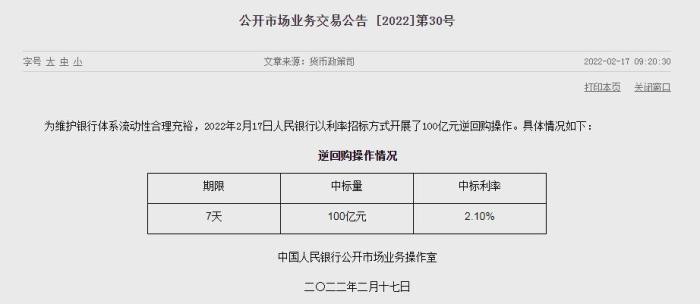 中新財(cái)經(jīng)2月17日電 17日,據(jù)中國人民銀行官網(wǎng)消息,為維護(hù)銀行體系流動(dòng)性合理充裕,2022年2月17日人民銀行以利率招標(biāo)方式開展了100億元逆回購操作,期限為7天,中標(biāo)利率為2.10%。(完)