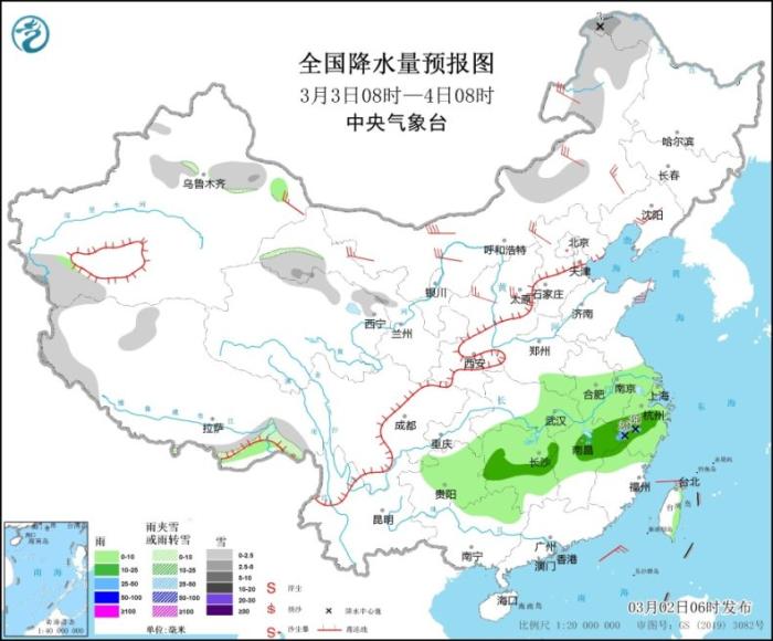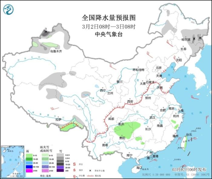 全國降水量預報圖(3月2日08時-3日08時)