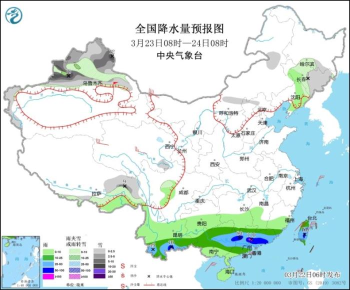 3月23日08時至24日08時,新疆北部和西部山區、吉林中東部、西藏東北部等地部分地區有小到中雪或雨夾雪,其中,新疆北疆東部和伊犁河谷部分地區有大到暴雪(10~18毫米)。云南南部、華南、臺灣島等地部分地區有中到大雨,其中,云南東南部、廣西東部、廣東中部和東部、臺灣島中南部等地部分地區有暴雨或大暴雨(100~110毫米)。內蒙古西部、青海、新疆東部等地部分地區有4~6級風,其中,新疆東部部分地區有7~8級風(見圖3)。