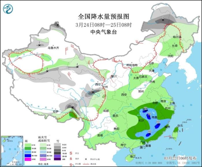 3月24日08時至25日08時,新疆北疆北部和南疆盆地西部、西藏東部、青海南部和西部、甘肅南部和河西、川西高原北部、內蒙古東部、黑龍江、吉林西部和東部等地部分地區有小到中雪或雨夾雪,其中,內蒙古東北部、黑龍江西部、新疆北疆北部、西藏東北部、青海東南部等地部分地區有大到暴雪(10~12毫米)。湖北東南部、江西大部、福建西部和中部、廣東中北部、廣西東部等地部分地區有大雨,其中,湖北東南部、江西西北部、福建西部、廣東北部等地部分地區有暴雨(50~80毫米)。新疆、西北地區大部、內蒙古中西部等地部分地區有4~6級風,其中,內蒙古西部、新疆東部、青海西部等地部分地區有6~7級風(見圖4)。